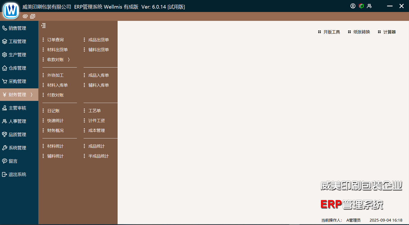 ● 子模塊包括:訂單查詢,成品入庫單、成品出貨單、材料入庫單、材料出貨單,外協(xié)加工單、日記賬、工藝單查詢、計(jì)件工資、成本管理、材料統(tǒng)計(jì)等。